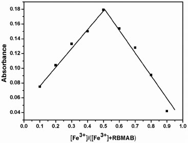 ![]() Figure 4. Job's plot of RBMAB in an ethanol-H2O (3:2, v/v, PBS buffer, 1.2 µmol L-1, pH 7.2) solution with a total concentration of [RBMAB] +Fe3+ = 50 µmol L-1. The absorption wavelength was 562 nm