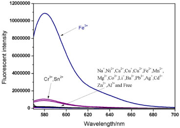 Fluorescence spectral response of RBMAB To further understand the selectivity of RBMAB for Fe3+, the changes in fluorescence intensity after various metal ions were added under identical conditions were also investigated. The fluorescence spectra of RBMAB (20 µmol L-1) in an ethanol-H2O (3:2 v/v, PBS buffer, 1.2 mmol L-1, pH 7.2) solution exhibits a notably weak fluorescence at 582 nm (λex = 562 nm) in the absence of metal ions, which indicates that the predominant form of RBMAB is the spirolactam form. When Fe3+ (200 µmol L-1, 10 eq.) was introduced to the RBMAB solution, a remarkable fluorescence enhancement was observed (Figure 5), which indicates that the Fe3+ ions induce the formation of the strongly fluorescent, ring-opened RBMAB-Fe3+ complex (Scheme 2).The fluorescence enhancement of Fe3+ to RBMAB is as high as 180-fold. Other metal ions showed no obvious fluorescence enhancement under the same conditions. These results further demonstrate that RBMAB can function as a highly sensitive and selective fluorescent chemosensor for Fe3+ over various other metal ions.