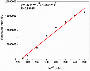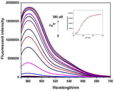 ![]() Figure 9. Fluorescence intensity at 582 nm of RBMAB (20 µmol L-1) in an ethanol-H2O (3:2 v/v, PBS buffer, 1.2 mmol L-1, pH 7.2) solution with different amounts of Fe3+. The excitation wavelength is 562 nm