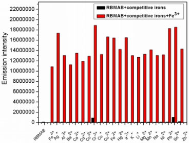 ![]() Figure 7. Metal-ion selectivity profiles of RBMAB (10 µmol L-1). The black bars represent the fluorescence intensity (582 nm) of RBMAB in the presence of 10 eq. of free ions in the absence of Fe3+ while the red bars represent after the addition of Fe3+