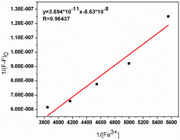 ![]() Figure 8. Benesi-Hildebrand plot (λem= 582 nm) of 1/(F - F0) vs. 1/[ Fe3+] based on a 1:1 association stoichiometry between RBMAB and Fe3+