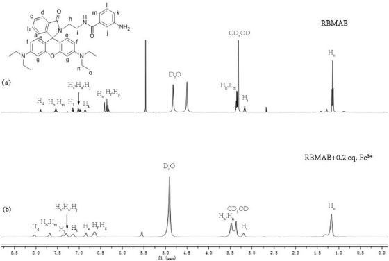 ![]() Figure 10. 1H NMR spectra (500 MHz, 298K, methanol-d4:D2O (5:1 v/v)) of (a)RBMAB and (b) RBMAB +0.2 equivalent Fe3+