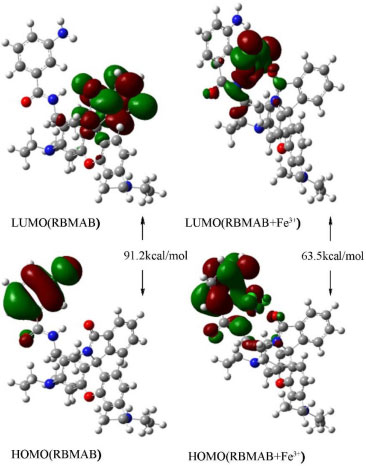 Density functional theory (DFT) calculations To better understand the nature of the coordination of Fe3+ with RBMAB, the energy-optimized structures of RBMAB and RBMAB-Fe3+ (Figure 11) were obtained using DFT calculations with the B3LYP method, where 6-31+G(d,p) was the basis set. The spatial distributions and orbial energies of the HOMO and LUMO of RBMAB and RBMAB-Fe3+ were also generated using DFT calculations (Figure 12). The results indicate that RBMAB, the HUMO was spread over the side benze moiety, whereas the HOMO was distributed on the spirolactam of rhodamine B moiety. The π electron on the HOMO of the RBMAB-Fe3+ complex were also mainly located on the side benze moiety, whereas the LUMO was mostly located on the guest Fe3+ ion. The energy gaps between the HOMO and LUMO in the probe RBMAB and RBMAB-Fe3+ were calculated to be 91.2 kcal mol-1 and 63.5 kcal mol-1 respectively. The results show that the binding of Fe3+ to RBMAB decreases the HOMO-LUMO energy gap of the complex and stabilizes the system.