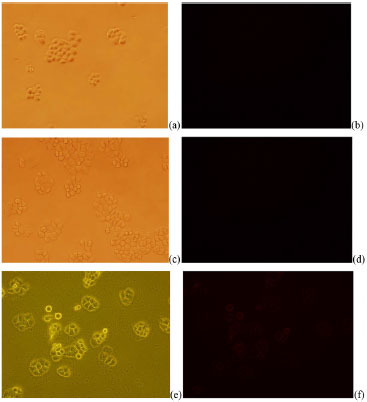 ![]() Figure 13 Fluorescence images of human L-02 hepatocytes incubated with RBMAB and/or Fe3+. The L-02 cells were incubated with 0.1 mmol L-1 FeCl3 in 50 mmol L-1PBS buffer for120 min at room temperature, followed by 20 µmol L-1 RBMAB for additional 30 min (e: bright-field image; f: fluorescence image). The DMSO-treated cells were taken as a control (a: bright-field image; b: fluorescence image), and only RBMAB-treated cells were also taken as a control (c: bright-field image; d: fluorescence image).