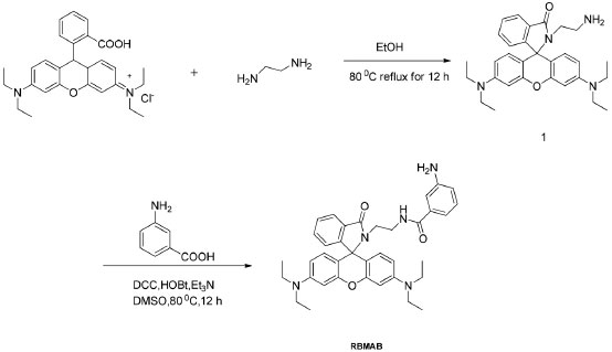 RESULT AND DISCUSSION Synthesis of RBMAB The synthesis procedure of RBMAB is illustrated in Scheme 1. Compound 1 was prepared in a 92% yield from commercially available rhodamine B and ethane-1,2- diamine.36 RBMAB was prepared in a 71.8% yield by the reaction of 3-aminobenzoic acid with 1.5 equiv of compound 1, 1.5 equiv of DCC, 1.5 equiv of HOBt and 1.5 equiv of triethylamine in DMSO for 12 h. The structure of RBMAB was confirmed by 1H NMR, 13C NMR and HRMS (Supporting materials).