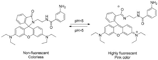 Responses of RBMAB to pH To investigate the pH response of probe RBMAB, acid-base titration experiments were performed in EtOH/H2O (3:2, v/v) solutions. The fluorescence intensities of RBMAB at 582 nm at different pH values (1.02, 2.05, 2.94, 4.07, 5.08, 6.02, 7.05, 7.96, 9.03 and 10.06) were recorded. As shown in Figure 1, RBMAB did not emit any distinct and characteristic fluorescence (λex = 562 nm) in the pH range of 5.0-10.0, the result indicated that the spirolactam form of RBMAB was the predominant species (Scheme 2). When the pH was adjusted to between 1.0 and 5.0, the fluorescence intensity at 582 nm was apparently enhanced due to the ring-opening process of the spirocyclic moiety of Rhodamine B (Scheme 2).19,20 These results showed that RBMAB was insensitive to pH from 5.0 to 10.0 and may work under approximately physiological conditions with very low background fluorescence. Therefore, further UV-vis and fluorescence studies were carried out in a EtOH/H2O (3:2 v/v, PBS buffer, 1.2 mmol L-1, pH 7.2) solution.