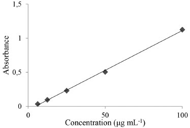 ![]() Figure 1. Linearity for total phenols obtained with the Folin-Ciocalteau method (n=3)