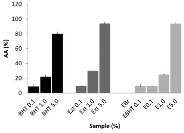 The extract obtained had a total phenols concentration of 58.25 ± 0.06 mgGAE / g of dry extract. This value is higher than that observed in the study conducted by Barros (2011), where the concentration for an ethanol extract of pomegranate was 36 mgGAE / g. In a study by Gozlekçi,25 pomegranate bark was found to have a higher total phenolics content, with a value of 2747 mg L-1, when compared with the juice and seed of this fruit. For the emulsions, a correlation between the antioxidant activity of these pharmaceutical preparations and the content of soluble phenolic compounds was observed. The phenolic compounds incorporated into the emulsions were prepared in a concentration of 1 mg mL-1 and easily quantified. The results for the emulsions E0.1, E1.0, E5.0 and EBHT were (in mgGAE / g of formulation), respectively, 54.87 (± 0.10), 56.10 (± 0.10), 54.0 (± 0.12) and 58.22 (± 0.10). Antioxidant activity evaluation with DPPH The evaluation of the in vitro antioxidant activity was carried out applying a spectrophotometric method with the use of DPPH. This method is considered to be accurate, fast, simple and of low cost and it is suitable for the determination of the antioxidant capacity of pure chemicals and complex mixtures of compounds, such as extracts obtained from plants. The assessment of the in vitro antioxidant activity (AA%) through the use of the DPPH radical (2,2-diphenyl-1-picrylhydrazyl) was evaluated by observing the color change from purple to yellow, indicating that the samples were able to reduce this radical. The ethanolic extracts, obtained by the maceration method, and the emulsions were able to react with DPPH, showing a correlation between the total phenolics content and the antioxidant activity. The experiments revealed a greater activity for the concentrated extract, which reduced in accordance with the dilutions. This was also observed for the formulations with different extract concentrations, with a proportional dose/response relationship. For this test, emulsions containing BHT in the concentration generally used to achieve antioxidant activity (0.1%) were used. It was also observed that the cream base showed no antioxidant activity and that it does not interfere with the activity of the ethanolic extract, demonstrating the specificity of the method. Regarding the comparison between the in vitro antioxidant activity of the extract of natural origin and the commercial antioxidant commonly used for this purpose in cosmetic formulations, it was observed that there was parity with regard to the radical reduction capacity. Thus, the ethanolic extract of the pomegranate bark, at the same concentration as the BHT, showed equivalent activity in both of the pure extracts, with no significant difference being observed (Figure 2).