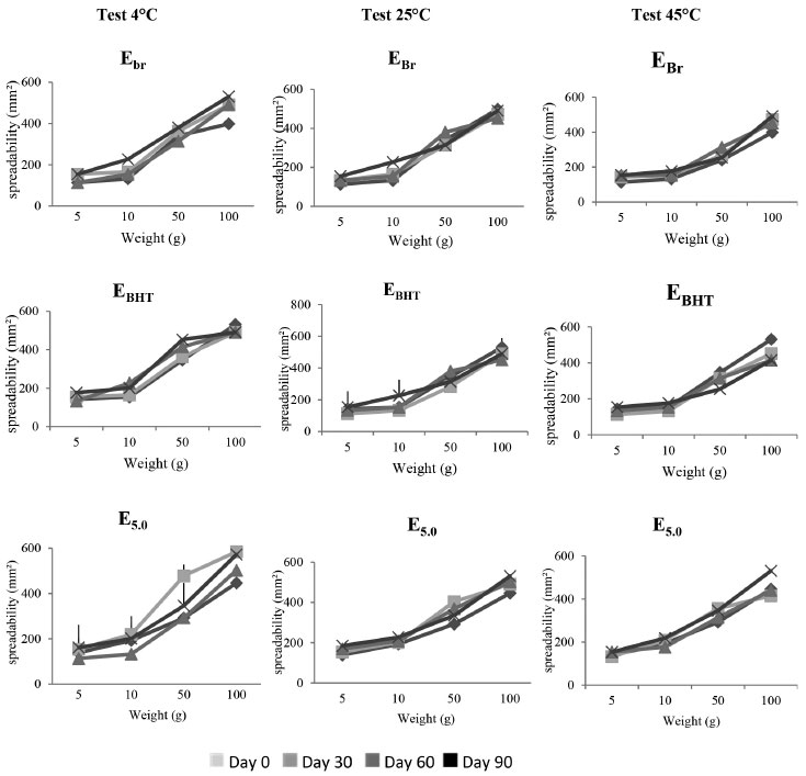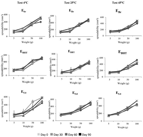 For the control formulation (EBr), at 25 ºC, the G' values are generally much higher than the G" values, suggesting a considerable presence of elastic interactions, forming a structured network. Therefore, the system is characterized as predominantly solid with elastic characteristic. This characteristic was also observed for the E0.1 formulation, behavior consistent with a study by Vianna Filho31 in which emulsions with polysaccharide added were investigated. In the cited study, all of the samples obtained G´ values higher than G" over the entire range of frequency investigated, with a slight increase in the slope at higher frequencies. The figure relates to the formulation E1.0 at 25 ºC, and it can be observed that G' is also higher than G'', which is reversed with increasing frequency, indicating that at this ratio the formulation undergoes a state transition from elastic solid to viscous liquid. This behavior indicates a greater instability for the semissolid formulation, changing from an initially solid formulation to a more viscous one. Finally, the formulation E5.0, at 25 ºC, also showed higher G' values than G'' values, although they were almost the same at high frequencies. This indicates that with an increase in the proportion of the active component, even with a disturbance in the elastic interactions at high frequencies, the system maintains solid elastic characteristics and solid/liquid transitions do not occur in the system. In the emulsified or polymeric formulations, for a well-defined molecular structure, dynamic results can be used for variations related to increasing the proportion of extract.32 The results of these tests may indicate that due to the complex molecular structure of plant extracts the proportion used can influence the degree of interaction with the formulation components, and the effect can vary depending on the frequency of the elastic modulus. In addition, this data may be directly related to the stability of the formulations.33 Thus, formulations that have not undergone a solid/liquid transition tend to have greater stability. Accelerated stability The behavior of the formulations containing pomegranate extract in different concentrations was similar to that found during the preliminary stability evaluation. Thus, with no significant physico-chemical changes in the formulations of interest, the formulation containing the highest concentration of extract (E5.0) was chosen for the accelerated stability studies. The parameters used to evaluate the accelerated stability (macroscopic analysis, spreadability determination, and pH) demonstrated that the macroscopic characteristics of the EBr and EBHT formulations remained constant during the whole study period, regardless of the temperature applied in the tests. The same was observed for the samples containing pomegranate extract (E5.0) at room temperature and with cooling. However, for the emulsions (E5.0) kept in the incubator, there was a slight enhancement of the color during the 90-day study period. This result corroborates the findings of Balogh,11 who evaluated the stability of pomegranate glycolic extract and observed that samples stored in an incubator also showed a darkening of the color in the course of the study. In addition to this feature, Balogh observed an odor reduction under incubator and refrigerator conditions, which did not occur in our study. Therefore, it appears that the physical changes in the formulations containing the extract, stored in an incubator, may be the result of the acceleration of oxidation reactions, which culminates with the intensification of the color of the formulation.34 The spreadability is an important parameter related to the uniformity of the cream on the skin and the product stability. Figure 4 shows the results of the spreadability study for samples at different temperatures (4 ºC, 25 ºC and 45 ºC). The spreadability of formulations showing similar behavior and there was no significant difference between the base values for maximum spreadability with increasing storage temperature. Thus, with the incorporation of the extract the cream spreadability was maintained. Formulations with BHT presented slightly lower spreadability than the other formulations, although the values showed no statistical difference. This is probably due to the moisture loss, therefore there is one dryness of cream.18