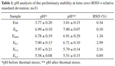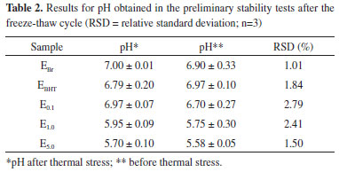 A reduction in the pH of the emulsions can be noted with increasing extract concentration (Table 1). Moreover, it was observed that there was no significant difference between the hydrogen potential values before and after heat stress, demonstrating the stability of the emulsions regarding this parameter. New formulations were prepared and then submitted to cycles of freezing and thawing. Macroscopic analysis and the determination of the pH of the samples, with and without the application of heat stress, were then performed (Table 2). The samples maintained the same characteristics observed before the freeze-thaw cycles, both for samples submitted to heat stress and those maintained under normal conditions. Casteli30 observed phase separation in three out of seven samples submitted to heat stress. Similar results were observed by Morais6 for five out of eighteen samples when submitted to centrifugation, and only one of the formulations did not show phase separation. Additionally, in this same study, after being subjected to the freeze-thaw cycle, with and without combined centrifugation, all samples maintained their initial characteristics. Thus, the anionic formulations developed are more stable than those reported in the literature.