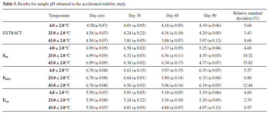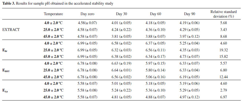The results obtained for the pH are shown in Table 3. According to these data, it can be observed that, at the temperatures studied, the formulations containing pomegranate bark extract showed less pH variation during the analysis. On the other hand, the EBr and EBHT formulations showed large variations in this parameter over time, with relative standard deviations higher than the values recommended by legislation,18 except for the sample kept at room temperature. Therefore, the formulation prepared in this study again showed greater stable than that containing an antioxidant currently widely in use (BHT).