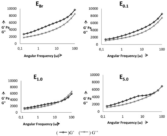 The freeze-thaw cycle caused a slight variation in the pH of all samples, including the white emulsion and the emulsion containing a higher concentration of the vegetable extract. The formulations with minor changes in this parameter were EBr and E5.0, but no samples obtained a variation higher than those recommended by current legislation.18 It was noted that when analyzing the pH at time zero and the pH after the freeze-thaw cycle without heat stress, no significant changes were observed. The same scenario was observed in a study by Pianovski,17 who evaluated emulsions containing pequi oil and changes in pH after freezing and thawing cycles were minimal. Rheological evaluation The graphs in Figure 3 show the evolution of the storage modules G' (elastic modulus/solid elastic) and loss G" (viscous modulus/viscous liquid) as a function of frequency. The first graph represents the oscillatory dynamic testing of the control formulation and the others an analysis of the semissolid formulations E0.1, E1.0 and E5.0 respectively.