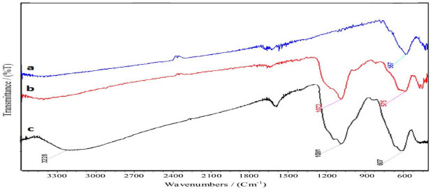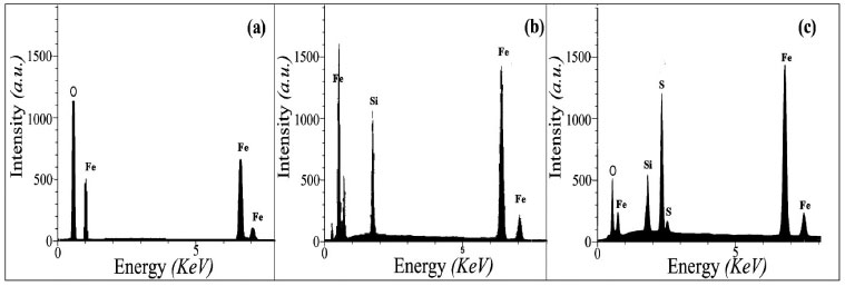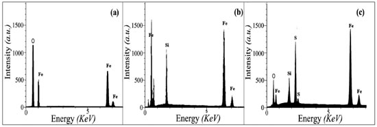 RESULTS AND DISCUSSION In the initial experiments Fe3O4@SiO2-SO3H nanocomposites was prepared and characterized by EDX, SEM XRD, FT-IR VSM and TEM analysis. The chemical purity of the samples as well as their stoichiometry was tested by EDX studies. The EDX spectrum given in Figure 1a shows the presence of Fe and O as the only elementary components of Fe3O4 NPs. EDX spectrum Fe3O4@SiO2 (Figure 1b) shows the elemental compositions are (Fe, O and Si) of core-shell nanocomposites. EDX spectrum of Fe3O4@SiO2-OSO3H (Figure 1c) shows the elemental compositions are (Fe, Si, O and S) of magnetic nanocomposites.