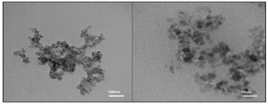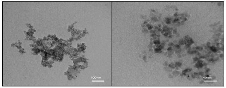 The size and morphology of Fe3O4@SiO2-SO3H nanocomposites were analyzed by Transmission electron microscopy (TEM) (Figure 6). The results show that these nanocatalysts consist of spherical particles with the crystallite size about 30 nm, confirming the results calculated from Scherrer's formula based on the XRD pattern.
