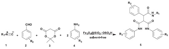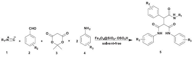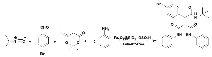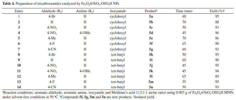 General procedure for the preparation of tricarboxamide derivatives A mixture of isocyanide (1 mmol), aromatic aldehyde (1 mmol), Meldrum's acid (1 mmol), aromatic amine (2 mmol) and Fe3O4@SiO2-OSO3H nanocomposite (0.003 g) were heated in a sealed tube at 50 ºC for appropriate times. Progress of the reaction was continuously monitored by TLC. After completion of the reaction, the mixture was cooled to room temperature and then was dissolved in methanol and then the nanocatalyst was separated using an external magnet. The solvent was evaporated under vacuum and the solid obtained recrystallized from EtOH to afford the pure tricarboxamides. All of the products were characterized and identified with m.p., 1H NMR, 13C NMR and FT-IR spectroscopy techniques. Spectral data of new compounds N2-cyclohexyl-2-(4-fluorophenyl)-N1,N'1-diphenylethane-1,1,2-tricarboxamide (5f): White solid; m.p 303-304 ºC; FT- IR (KBr): 3314 (NH), 3291 (NH), 1673 (CO), 1615 (C=C), 1462 (C=C) cm-1; 1H NMR (400 MHz, DMSO-d6) δ/ppm : 0.99-1.32 (m, 10 H, 5CH2), 3.27 (m, 1H, NCH), 4.01 (d, 1H, CH), 4.11 (d, 1H, CH), 6.91-7.63 (m, 14H, Ar), 8.41 (bs, 1H, NH), 10.12 (s, 2H, 2 NH); 13C NMR (100 MHz, DMSO-d6) δ/ppm : 173.1 (C=O), 169.4 (C=O), 149.1, 147.9, 144.6, 143.2, 131.3, 127.4, 121.2, 118.1, 64.3, 52.1, 48.1, 31.5, 30.4, 27.8. MS (EI) (m/z): 487 (M+); Anal. Calcd. mass fraction of elements, w/% for C29H30FN3O3 (Mr = 487.23) are: C 71.44; H 6.20; N 8.62; Found: C 71.32; H 6.26; N 8.69. 2-(4-cyanophenyl)-N2-cyclohexyl-N1,N'1-diphenylethane-1,1,2-tricarboxamide (5g): White solid; m.p 312-315 ºC; FT- IR (KBr): 3325 (NH), 3286 (NH), 2211 (CN), 1668 (CO), 1584 (C=C), 1453 (C=C) cm-1; 1H NMR (400 MHz, DMSO-d6) δ/ppm : 1.01-1.29 (m, 10 H, 5CH2), 3.31 (m, 1H, NCH), 4.03 (d, 1H, CH), 4.10 (d, 1H, CH), 6.95-7.42 (m, 14H, Ar), 8.38 (bs, 1H, NH), 10.09 (s, 2H, 2 NH); 13C NMR (100 MHz, DMSO-d6) δ/ppm : 172.8 (C=O), 168.1 (C=O), 149.2, 147.9, 145.1, 143.6, 131.3, 127.4, 120.8, 119.2, 116.5, 62.1, 51.9, 48.3, 30.8, 29.2, 27.6. MS (EI) (m/z): 494 (M+); Anal. Calcd. mass fraction of elements, w/% for C30H30N4O3 (Mr = 494.23) are: C 72.85; H 6.11; N 11.33; Found: C 72.97; H 6.16; N 11.19. N2-(tert-butyl)-2-(4-fluorophenyl)-N1,N'1-diphenylethane-1,1,2-tricarboxamide (5m): White solid; m.p 285-287 ºC; FT- IR (KBr): 3303 (NH), 3278 (NH), 1675 (CO), 1606 (C=C), 1458 (C=C) cm-1; 1H NMR (400 MHz, DMSO-d6) δ/ppm : 0.98-1.22 (s, 9 H, 3CH3), 3.87 (d, 1H, CH), 4.11 (d, 1H, CH), 7.07-7.64 (m, 14H, Ar), 8.27 (bs, 1H, NH), 10.23 (s, 2H, 2 NH); 13C NMR (100 MHz, DMSO-d6) δ/ppm : 176.2 (C=O), 172.5 (C=O), 151.2, 149.8, 144.1, 143.2, 131.1, 128.1, 120.7, 118.6, 64.1, 50.8, 42.9, 28.1. MS (EI) (m/z): 461 (M+); Anal. Calcd. mass fraction of elements, w/% for C27H28FN3O3 (Mr = 461.21) are: C 70.26; H 6.12; N 9.10; Found: C 70.42; H 5.98; N 9.03. N2-(tert-butyl)-2-(4-cyanophenyl)-N1,N'1-diphenylethane-1,1,2-tricarboxamide (5n): White solid; m.p 293-295 ºC; FT- IR (KBr): 3341 (NH), 3291 (NH), 2216 (CN), 1678 (CO), 1603 (C=C), 1483 (C=C) cm-1; 1H NMR (400 MHz, DMSO-d6) δ/ppm : 1.02-1.33 (m, 9 H, 3CH3), 3.91 (D, 1H, CH), 4.11 (d, 1H, CH), 6.98-7.53 (m, 14H, Ar), 8.22 (bs, 1H, NH), 10.14 (s, 2H, 2 NH); 13C NMR (100 MHz, DMSO-d6) δ/ppm : 171.1 (C=O), 168.4 (C=O), 148.8, 147.5, 145.1, 142.4, 129.1, 128.6, 123.7, 111.4, 115.1, 63.9, 51.1, 38.8, 28.2. MS (EI) (m/z): 468 (M+); Anal. Calcd. mass fraction of elements, w/% for C28H28N4O3 (Mr = 468.22) are: C 71.78; H 6.02; N 11.96; Found: C 71.67; H 5.92; N 12.14. Recycling and Reusing of the Catalyst After completion of the reaction, the obtained product was dissolved in methanol and then the nanocatalyst was separated by an external magnet, then the nanocatalyst were washed three to four times with methanol and ethyl acetate and then dried overnight in an oven at 50 ºC. To investigate lifetime and level of recoverability of the Fe3O4@SiO2-OSO3H MNPs, the model study was carried out several times using recycled magnetite nanocomposite. The summarized results of Table 1 show that the recovered catalyst could be used for five successive runs with a slightly decreased in activity.