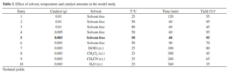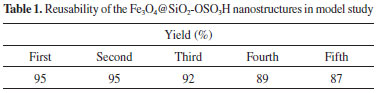 The reaction conditions were also investigated with different catalyst loading, revealing that 0.003 g of the catalyst provided the best results in terms of reaction time, economy of catalyst charge, and reaction yield (Table 3, entry 5). As shown in Table 3 increasing the amount of catalyst does not improve the yield of the product any further, whereas decreasing the amount of catalyst leads to decrease in the product yield. Hence, the optimum concentration of Fe3O4@SiO2-OSO3H was chosen 0.003 g in the model reaction.