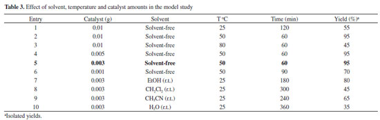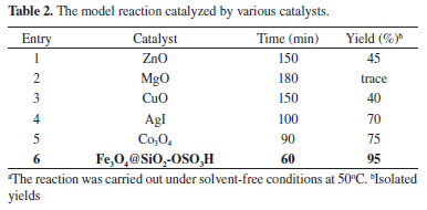During the optimization of reaction conditions the influence of solvent was studied when the model reaction was carried out using Fe3O4@SiO2-OSO3H MNPs by different solvents and also solvent-free conditions. We found that the best result was obtained when the reaction was carried out under solvent-free conditions at 50 ºC. Increasing temperature showed unsatisfactory effect on the yield and reaction time (Table 3).