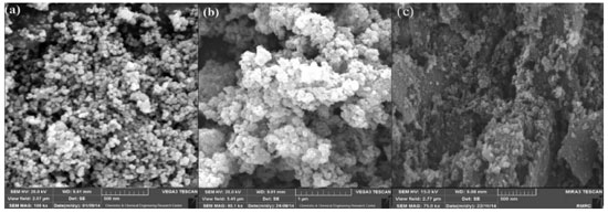 Scanning electron microscopy (SEM) is a useful tool for determining the size distribution, particles shape, and porosity. It has been a primary tool for characterizing the surface morphology and fundamental physical properties of the surface. According to Figure 2b, Fe3O4@SiO2 nanocomposites still keep the morphological properties of Fe3O4 (Figure 2a) except for a slightly larger particle size and smoother surface, while silica are uniformly coated on the Fe3O4 particles to form silica shell compared to the Fe3O4@SiO2, The SEM image shown in Figure 2c demonstrates that Fe3O4@SiO2-OSO3H nanocomposite are nearly spherical with about 30 nm in size.