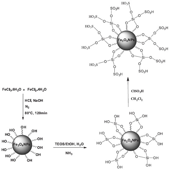 EXPERIMENTAL General Chemicals were purchased from the Sigma-Aldrich and Merck in high purity. All melting points are uncorrected and were determined in capillary tube on Boetius melting point microscope.1H NMR and 13C NMR spectra were obtained on Bruker 400 MHz spectrometer with DMSO-d6 as solvent using TMS as an internal standard. FT-IR spectrum was recorded on Magna-IR, spectrometer 550. The elemental analyses (C, H, N) were obtained from a Carlo ERBA Model EA 1108 analyzer. Powder X-ray diffraction (XRD) was carried out on a Philips diffractometer of X'pert Company with mono chromatized Cu Kα radiation (λ = 1.5406 Å). Microscopic morphology of products was visualized by SEM (LEO 1455VP). The mass spectra were recorded on a Joel D-30 instrument at an ionization potential of 70 eV. Transmission electron microscopy (TEM) was performed with a Jeol JEM-2100UHR, operated at 200 kV. Magnetic properties were obtained on a BHV-55 vibrating sample magnetometer (VSM) made by MDK-I.R.Iran. The compositional analysis was done by energy dispersive analysis of X-ray (EDX, Kevex, Delta Class I). Preparation of Fe3O4 nanoparticles Fe3O4 nanoparticles were prepared according to the procedure reported by Zhang et al.32 To a solution of FeCl2.4H2O (2.5 g) and FeCl3.6H2O (6 g) in 30 mL deionized water was added dropwise 1.0 mL of concentrated hydrochloric acid at room temperature. The solution was added in to 300 mL of 1.5 mol L-1 NaOH and then the solution was stirred vigorously at 80 ºC until precipitation. Afterwards, the prepared magnetic nanoparticles were separated magnetically, washed with deionized water and then dried at 70 ºC for 8 h. Preparation of Fe3O4@SiO2 nanocomposite The core-shell Fe3O4@SiO2 nanocomposite were prepared according to the previously reported method.33 Briefly 1g of Fe3O4 nanoparticles was treated with 0.5 mol L-1 HCl aqueous solution (25 mL) by sonication. After the treatment for 10 min, The magnetite particles were separated and washed with deionized water, and then homogeneously dispersed in the mixture of ethanol (60 mL), deionized water (100 mL) and concentrated ammonia aqueous solution (10 mL, 28 wt. %), followed by the addition of tetraethylorthosilicate (TEOS, 0.22 g, 0.144 mmol). After stirring at room temperature for 2 h, the Fe3O4@SiO2 nanocomposite were separated using an external magnet and washed with ethanol and water. Preparation of Fe3O4@SiO2-OSO3H nanocomposite Fe3O4@SiO2-SO3H MNPs were prepared according to a previously reported procedure by Kiasat and Davarpanah (Scheme 1).14 A suction flask equipped with a constant-pressure dropping funnel. The gas outlet was connected to a vacuum system through an adsorbing solution of alkali trap. Firstly, Fe3O4@SiO2 (1 g) was added to the flask and dispersed in dry CH2Cl2 (10 ml) by ultrasonic for 30 min. Subsequently, chlorosulfonic acid (1 ml) was added drop-wise to a cooled (ice-bath) solution of Fe3O4@SiO2 (1 g) over a period of 30 min at room temperature. After completion of the addition, the mixture was stirred for a further 6 h until to allow for the complete dissipation of HCl from the reaction vessel. The resulted MNPs were separated using an external magnet and washed with ethanol and water before been dried in an oven at 70 ºC to give Fe3O4@SiO2-OSO3H as a brown powder.