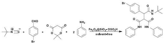 Initially, to optimize the reaction conditions, the reaction of 4-bromobenzaldehyde, Meldrum's acid, tert-butyl isocyanide and aniline was selected as a model reaction (Scheme 2).