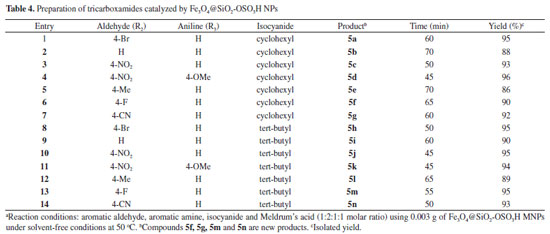 CONCLUSIONS In summary, we have described a highly effective, mild and green approach for the preparation of tricarboxamide using Fe3O4@SiO2-OSO3H nanocomposites under solvent-free conditions at 50 ºC. The products were obtained in excellent yields and short reaction times via one-pot pseudo-five component reactions of isocyanides, aldehydes Meldrum's acid and 2 equiv. of amines. The salient properties of the applied nanocatalyst are simple work-up procedure, ease of separation, and recyclability of the magnetic nanocatalyst.