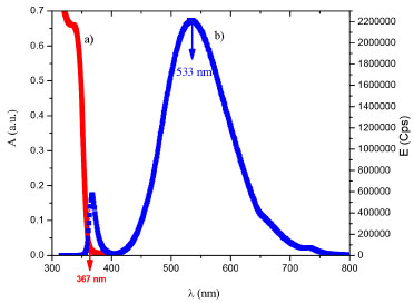 ![]() Figure 1. a) UV-vis absorption spectrum and b) Emission spectrum of the colloid of ZnO nanoparticles in ethanol