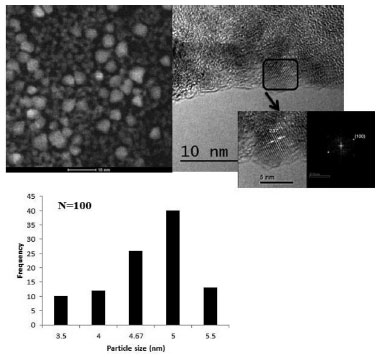 ![]() Figure 2. HR-TEM micrograph selected of ZnO nanoparticles and its size distribution
