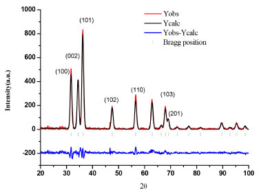 ![]() Figure 3. X-Ray pattern diffraction of ZnO nanoparticles powder and its corresponding Rietveld refinement plot. Space group P63mc, a = 3.252 Å, b = 3.252 Å, c = 5.2102, α = 90º, β=90º, γ = 120º, χ2 = 2.0, Rwp = 0.269, Rp = 0.165, R exp = 0.1765