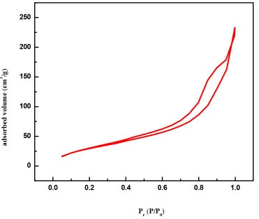 ![]() Figure 4. Adsorption-desorption isotherms of ZnO isolated powder SBET= 122.22 m2 g-1