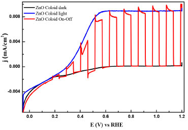 Electrochemical characterization and band gap determination Linear weep voltammetries under illumination and darkness using ZnO-FTO electrodes were carried out to demonstrate photo-induced charge separation and for band gap determination. Figure 5, shows a typical I vs E plot, where it can be observed at around 0.07 V/RHE where an electron-hole pair (e-/h+) separation process with no significant differences on Eonset. It is important to remark that, for semiconductor electrodes, the recombination is manifested as negative spikes in current density when illumination is cut-off, depending on the surface states and structural defects that are overcome when a strong electric field is achieved at high over potential in comparison with Eonset. In this case, the photocurrent, where recombination is not presented at E > 0.5 V/RHE. This is also confirmed by the chronoamperometric measurements presented in Figure 6. These experiments were recorded while polarizing at 1.0 V/RHE allowing the electrode to reach a stable current (dark current) and then irradiating it with polychromatic (UV-Vis) light. From such curves it is possible to conclude a very fast onset (On) and decay (Off) response to irradiation, which is analog to Figure 5 in the same potential range.28,29