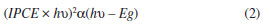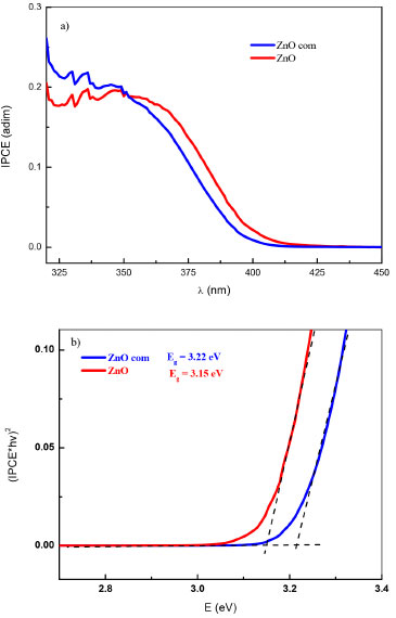 The quantum yield was also evaluated by photocurrent action spectra measurements. These measurements were recorded while the electrodes were polarized at 1.0 V/RHE and the wavelengths was scanned from 305 to 550 nm. From linear voltammetry it was established that when the electrodes are polarized at high potential values no recombination was observed and therefore reliable photocurrent spectroscopy could be measured. The IPCE (Incident Photon-to-electron Conversion Efficiency) is shown in Figure 7a). The absorption edge for colloidal ZnO occurs at λonset = 395 nm. Figure 7b) shows the Tauc plots for these electrodes, where the band-gap (Eg) was obtained from the intersection with X-axis (photon energy) of an extrapolated straight line where the absorption edge starts, see equation 2. The Eg value was 3.15 eV, which is smaller than the commercial material 3.22 eV. ![]()