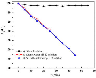 Competition between ethanol:water and ZnO in the photocatalytic degradation of anthracene Photochemical competition between ethanol and ZnO in anthracene transformation under UV radiation at 254 nm was studied using UV-visible absorbance measurements at 325, 340, 357, and 377 nm, characteristic of π→π* electronic transitions. Figure 9 shows a typical degradation efficiency (Ct/C0) vs. time plot for pure (a) ethanol, (b) ethanol:water pH 12 and (c) ZnO-ethanol:water pH 12. When pure ethanol was used, the degradation of anthracene did not occur. On the other hand in reaction system containing ethanol:water (pH 12) a degradation efficiency of 30% was recorded at 25 minutes. After this time anthracene was not detected, yielding a yellowish solution with two new signals at 450 and 375 nm, associated to the presence of anthraquinone derivatives.31,32 In the presence of ZnO no change in color solution was observed and a degrataion efficiency of 60 % was achived at 55 minutes. Using integrated rate equations for chemical kinetic analysis the systems ethanol:water pH 12 in the presence and in the absence of ZnO presented a first-order reaction, with similar reaction-rate constant values. Table 1 summarizes kinetic parameters obtained by fitting data.33