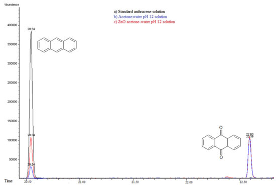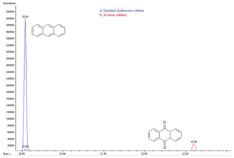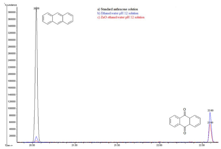 A comparison between these kinetic parameters suggests a similar reaction mechanism at initial times. However, the fact that anthracene is detected at longer photocatalysis time (55 minutes) in the presence of semiconductor, suggests a parallel degradation pathway. Extracted solutions with CHCl3 for both cases were analyzed using gas chromatography coupled to mass spectrometry (GC/MS). Figure 10 shows gas chromatograms in CHCl3 for (a) anthracene standard solution (20ppm) and the obtained extracts from (b) photolysis solution (ethanol:water pH 12) and from (c) photocatalytic solution (ZnO-ethanol:water pH 12). A decrease in ion abundance for signal at retention time value of 20.55 min, associated to anthracene is registered. It can also be observed a new signal at 22.70 min retention time, attributed to 9,10-anthraquinone. Mass spectrum of the aforementioned signals confirm this assertion, see Figure 11.
