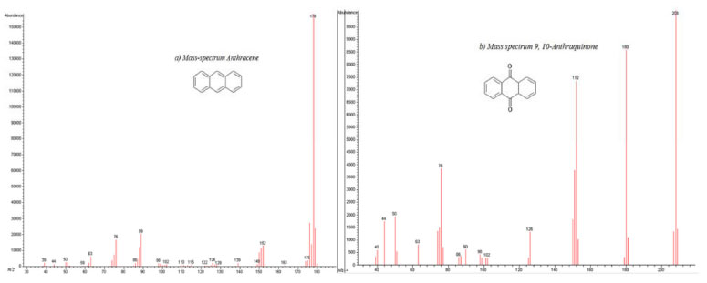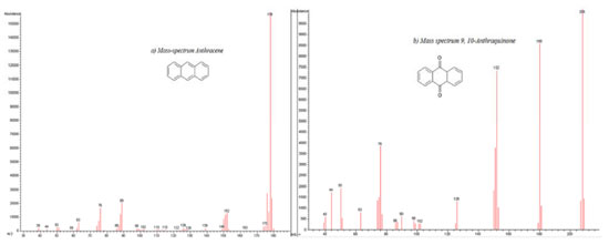 Figure 11. Experimental Mass spectra of: a) Anthracene at Rt=20.55 min and b) 9, 10-anthraquinone at Rt=22.60 min