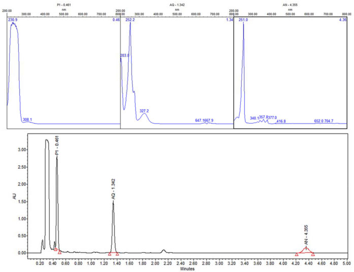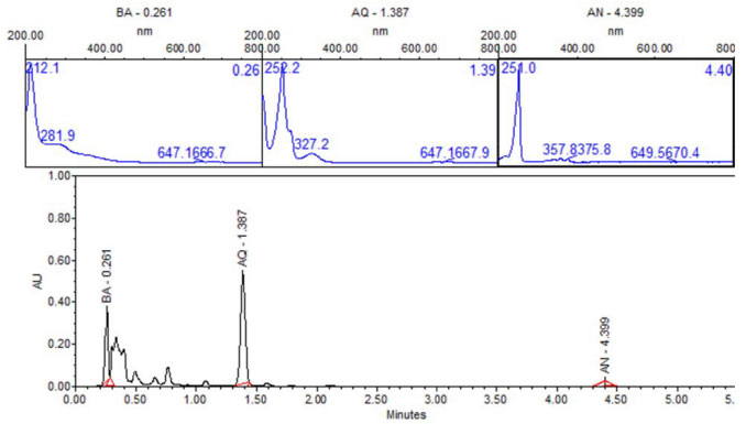 Figure 12. UPLC of sample-photocatalysis of anthracene with ZnO-ethanol:water pH 12. BA-Benzoic acid, AQ-9, 10-anthraquinone and AN-Anthracene