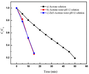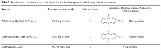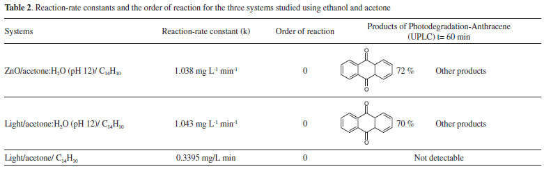 Photocatalytic reaction of anthracene in acetone:water in the presence and in the absence of ZnO Figure 14 shows a typical degradation efficiency (Ct/C0) vs. time graph for (a) pure acetone, (b) acetone:water pH 12 and (c) ZnO-acetone:water pH 12 exposed to a UV radiation (254 nm). In the reaction systems (b) and (c) anthracene absorption signals are not presented after 15 minutes. A change in color solution from colorless to yellow associated to the presence of anthraquinone derivatives, with absorption signals at 395, 423, 476 nm, are also observed.31,32 In the presence of pure acetone (a) anthracene is still detected near to 50 minutes of photolysis. No changes in color solution were observed. Using chemical kinetic analysis, all systems presented a zero-order reaction. For acetone:water pH 12 and ZnO-acetone:water pH 12 the same reaction rate constant value for anthracene photo-transformation was calculated, which is lower than that obtained for pure acetone, see Table 2.
