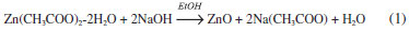 EXPERIMENTAL SECTION Reagents Zinc acetate dihydrate, Zn(CH3COO)2·2H2O (J. T. Baker, 99 %); sodium hydroxide, NaOH (J. T. Baker, 98.2 %); ethyl alcohol absolute, CH3CH2OH (Aldrich 99 %); acetone, CH3COCH3 (Aldrich 99 %); hydrochloric acid, HCl (J. T. Baker; 37.3 %); anthracene, C14H10 (Aldrich 99 %); dichloromethane, CH2Cl2 (J. T. Baker 99 %); were used without further purification; multicomponent solution (RESTEK 99 %); ultrapure water (18 MΩ cm-1) was obtained from a UV Millipore system. Synthesis of colloidal ZnO nanoparticles ZnO nanoparticles in colloidal dispersions were obtained by a modification of a previously described method,15 which presents the advantage of being a one pot synthesis. The reaction corresponds to a simple alkaline hydrolysis of zinc acetate (Equation 1). 0.011 g (0.0272 mmol) of Zn(CH3COO)2 ·2H2O was dissolved in 25 mL of ethanol at room temperature, followed by the addition of 0.325 mL of 0.2 mol L-1 NaOH in ethanol solution. The reaction mixture was heated for 2 hours at 60 ºC. ![]() The obtained colloidal dispersion was characterized by UV-Vis spectroscopy, using a Thermo Scientific Evolution Array spectrophotometer. Emission spectra was acquired with a spectrofluorometer Horiba Jobin Yvon/Fluorolog (λexc = 350 nm) from 315 to 800 nm. The morphology and size distribution of the ZnO nanoparticles were studied by high-resolution transmission electron microscopy (HR-TEM) (Tecnai F30-300 kV). Isolation and characterization of ZnO powder Freshly prepared colloidal dispersion of ZnO nanoparticles in ethanol was concentrated by slow evaporation with airflow over the solution, using a commercial 12 V fan until a slurry white solution was obtained. The dispersion was centrifuged at 3500 rpm for 20 minutes. A white powder was separated and washed with ethanol and acetone. XRD analyses were performed placing the sample over a glass slide, using a Bruker-AXS D8 advance diffractometer (Cu Kα λ = 1.5406 Å). The collected data was refined by the Rietveld method using the software FULLPROF SUITE.16,17 Thompson-Cox-Hastings pseudo-Voight function was used to model peak shape and preferred orientation. The background was modeled as a polynomial with 6 refined coefficients. The nitrogen adsorption-desorption isotherms were recorded using an Autosorb iQ2 equipment. The specific surface area was calculated by applying the BET equation to the nitrogen adsorption isotherm and the Barret-Joyner-Halenda (BJH) method to desorption branch of the nitrogen isotherm, respectively. Electrochemical characterization Electrochemical characterization was performed using ZnO deposit over photo-electrodes prepared by spin-coating technique with a home-made device, see Scheme 1. A ZnO suspension (15 mg mL-1 in ethanol) added at rate 60 µL min-1 with a rotating speed of 1800 rpm over a conducting glass substrate (SOLEMS, FTO 20 omhs). After spin-coating, a thermal annealing was performed at 200 ºC (10 ºC min-1, 1 h) under air. Electrical contact to the FTO was done with silver conducting paint (Radio Spares, 186-3593) to a copper wire and isolated with epoxy resin (3M, Scotch-weld DP-190). For all the experiments, a 0.1 mol L-1 NaOH solution (pH 12.9) outgassed with N2 was used as supporting electrolyte. The electrochemical measurements were performed at 25 ºC in a three-electrode cell equipped with a quartz window, using a SP-300 Bio-logic potentiostat-galvanostat. A glassy carbon electrode and a reversible hydrogen electrode (RHE) served as counter and reference electrode, respectively.