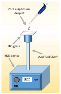 ![]() Scheme 1. Home-made spin-coating experimental setup. An rpm controllable device is modified to hold and rotate an ITO glass piece at 1800 rpm while dropping the prepared suspensions at an addition rate of 60 µL min-1 to cast a thin layer over the conductive glass