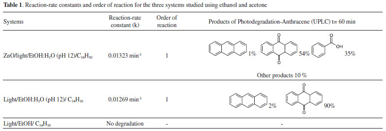CONCLUSION It was possible to study the photodegradation of anthracene to understand the effect of solvent in the presence and absence of ZnO nanoparticles. Comparing the reaction pathways in acetone and ethanol, marked differences were observed. When ZnO was used in ethanol:water pH 12 as reaction medium, colorless solutions with high oxidized products such as benzoic acid were detected due to photocatalysis and photolysis. In the case of ethanol:water pH 12 with photolysis processes are presented. Moreover, pure ethanol has no important role in the photodegradation of anthracene. On the other hand photocatalytic systems using acetone:water pH 12 solution the main product was the 9, 10-anthraquinone, with no participation of the semiconductor (occurring only photolysis). Finally, when acetone was use as reaction medium the photochemical transformation of the anthracene molecule yield probably simple polar byproducts.