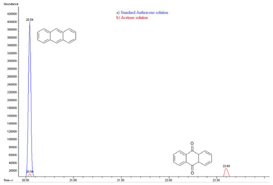 Figure 16. Gas Chromatography of a) Standard anthracene solution 20 ppm-acetone and b) Photolysis- Acetone solution