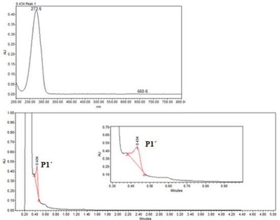 In order to explore the presence of byproducts, (GC/MS) and (UPLC), with a photodiode array detector (PDA) were also carried out. In the extracts obtained from all conditions, in GC/MS, the only detectable compounds were anthracene and 9,10-anthraquinone, at retention time values at 20.52 and 22.60 minutes respectively, see Figures 15 and 16. Using (UPLC-PDA) the presence of anthracene and 9,10-anthraquinone was confirmed in the reaction media ZnO-acetone:water pH 12, see Figure 17. A summary of percentage (%) of the main compounds in all the photo-transformations are presented in Table 2. It should be highlighted that 9,10-anthraquinone is the main product in acetone:water pH 12 in the presence or in the absence of ZnO. A detail inspection of the chromatograms in Figures 17 (ZnO-acetone:water pH 12, photocatalysis) and Figure 18 (pure acetone, photolysis), show two signals, P1 and P1´ with retention time values of 0.461 and 0.434 minutes respectively. UV-vis spectra of these signals presented absorption maximum bands at 273 and 308 nm, probably associated to simple polar byproducts, not detected in CHCl3 extracts analyzed with GC/MS. These results are in agreement with that reported by Mallakin et al.41 However, in a future work, this should be confirmed by the development of specific chromatographic methods.