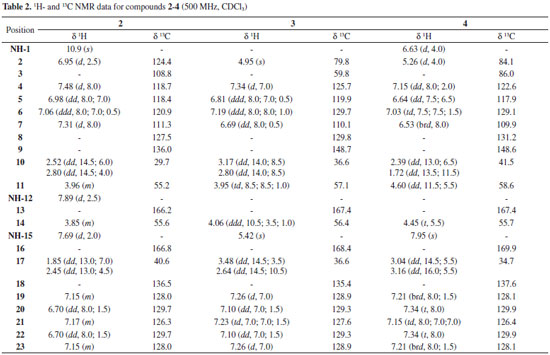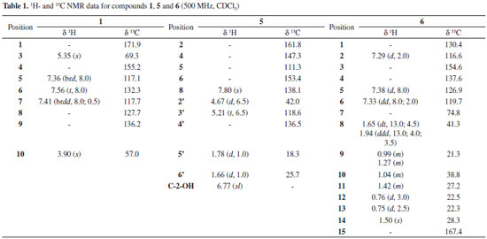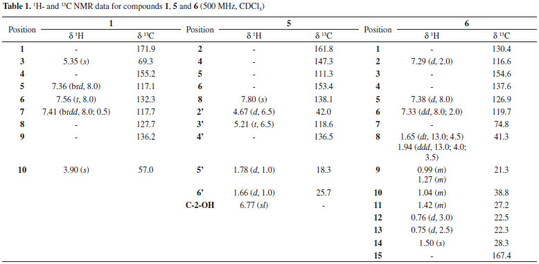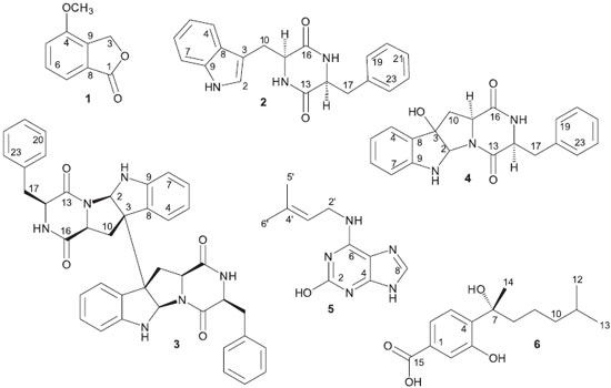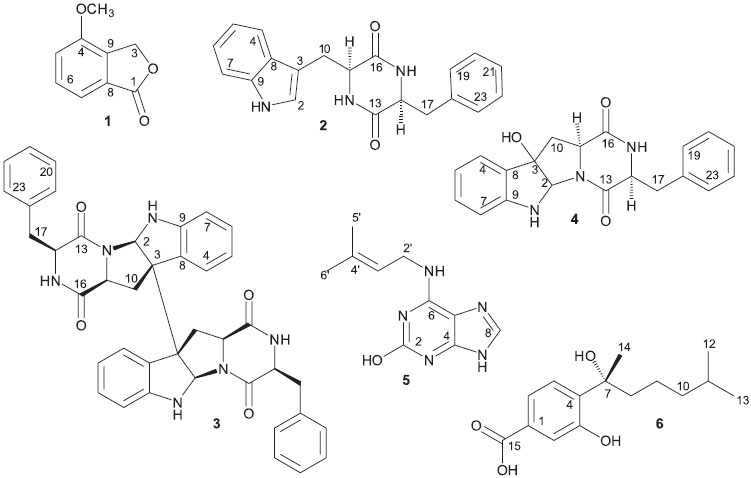 RESULTS AND DISCUSSION The EtOAc extract of A. versicolor cultivated in sterilized PDB liquid medium led to the isolation of six compounds. The structures of the compounds were elucidated using 1-D, 2-D NMR (Table 1 and 2), MS techniques were also carried out and comparison was made with the literature data.7-12 The compounds were identified as three peptide derivatives: cyclo-(tryptophyl-phenylalanyl) (2), diketopiperazine dimer WIN 64821 (3), 3-hydroxy-15H-tryptophenaline (4) and 2-hydroxy-6-N-isopentenyl-adenine (5), 4-methoxyphtalide (1) and 3-hydroxy-4-(1-hydroxy-1,5-dimethyl-hexyl) benzoic acid (6) (Figure 1).