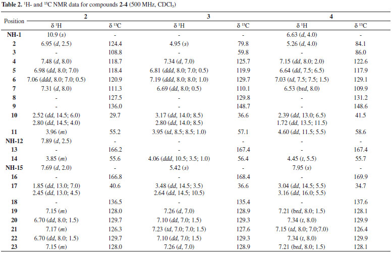 The molecular formula C9H8O3 of compound 1 was established by 13C NMR and HREIMS analysis, which showed the protonated molecular ion peak [M+H]+ at m/z 165.0597 (Calcd. to C9H8O3 165.0552) and indicated six degrees of unsaturation. The 13C NMR (Table 1) spectra of 1 when analyzed in combination with HSQC data, indicated the presence of six aromatic carbon, one methoxyl, one methylenic carbinolic and one carbonyl group. The 1H NMR spectra indicated the presence of three aromatic signals at δH 7.36 (brd, J = 8.0 Hz, H-5), 7.56 (t, J = 8.0 Hz, H-6), and 7.41 (brdd, J = 8.0, 0.5 Hz, H-7), indicating the aromatic system 1,2,3-trisubstituted ring. Additionally, the 1H NMR showed two signals at δH 3.90 (s, H-10) and δH 5.35 (s, H-3) characteristic of aromatic methoxyl and methylene proton, respectively. Thus, compound 1 was identified as 4-methoxyphtalide previously isolated from the endophytic fungus Pezicula sp. and Streptomyces strains.7 The molecular formula C20H19N3O2 of compound 2 was established by 13C NMR and HREIMS analysis, which showed the protonated molecular ion peak [M+H]+ at m/z 334.1520 (Calcd. to C20H19N3O2 334.1555) and the ion peak [2M+H]+ at m/z 667.3076, and indicated thirteen degrees of unsaturation. The 1H NMR not only indicated an indole ring related to proton signals δH 6.95 (d, J = 2.5 Hz, H-2, δC 124.4), δH 7.48 (d, J = 8.0 Hz, H-4, δC 118.7) and δH 7.31 (d, J = 8.0 Hz, H-7, δC 111.3), but also implied a monosubstituted benzene ring associated with proton signals at δH 7.15 (m, H-19/H-23, δC 128.0), δH 6.70 (dd, J = 8.0, 1.5 Hz, H-20/H-22, δC 128.0) and δH 7.17 (m, H-21, δC 126.3) The two carbonyl groups at δC 166.2 (C-13) and δC 166.8 (C-16) combined with the signals at δ 7.69 (d, J = 2.0 Hz, NH-15) and δ 7.89 (d, J = 2.0 Hz, NH-12), allowed us to identify compound 2 as cyclo-(tryptophyl-phenylalanyl) or cyclo (L-Trp-L-Phe) previously isolated from the endophytic fungus Penicillium sp. in 1996 ([α]20D -254.9 (c l.0, MeOH)). However, in our case, the optical rotation values of 2 was [α]26D -113.0 (c 0.50, MeOH), respectively. In fact, this result, in effect, suggests that compound 2 bears the same absolute configuration as the compound isolated from Penicillium sp.8 The molecular formula C40H36N6O4 of compound 3 was established by 13C NMR and HREIMS analyses, and was seen to present the protonated molecular ion peak [M+H]+ at m/z 665.2885 (Calcd. to C40H36N6O4 665.2876) and indicating twenty-six degrees of unsaturation. It is worth pointing out the remarkable similarities that were found between the 1H NMR spectra of 3 and 2, with the decrease observed in the extension of the tryptophan aromatic amino acid through the reduction of Δ2-3 present in the indole system besides the connection of C-2 (δC 79.8) to NH-12. This connection was confirmed by the correlation in HMBC experiment of H-2 [δH 4.95 (s)] with C-8 (δC 129.8) and C-9 (δC 148.7), and H-10 [δH 3.17 (dd, J = 14.0; 8.5 Hz, H-10a) and 2.80 (dd, J = 14.0; 8.5 Hz, H-10b) δC 36.6] to C-3 (δC 59.8), C-8 and C-16 (δC 168.4). Furthermore, a correlation was also observed in COSY between H-11↔H-10. The 13C NMR showed one primary diaminic and one quaternary carbon linker between two monomers of the dimer attributed to C-2 and C-3, respectively. The HMBC spectrum presented a correlation between H-2 and H-10b [δH 2.80 (dd, J = 14.0; 8.5 Hz)] with the carbon joining the dimeric C-3. The relative configuration of 3 was determined by 2D NMR experiments including NOESY spectra and in comparison with spectral data reported in the literature.12 Compound 3 was thus identified as dimer diketopiperazine WIN 64821 previously isolated from the endophytic fungus Aspergillus sp. in 1993 ([α]D = +200.0 (c 0.15, MeOH)). Nonetheless, in our case, the optical rotation values of 3 was [α]26D +350.0 (c 0.20, MeOH), respectively. Accordingly, this result implies that compound 3 has the same absolute configuration as the compound isolated from Aspergillus sp.9 The molecular formula C20H19N3O3 of compound 4 was established by 13C NMR and HREIMS analyses, and was found to depict the protonated molecular ion peak [M+H]+ at m/z 350.1412 (Calcd. to C20H19N3O3 350.3910), indicating thirteen degrees of unsaturation. The 1H NMR spectra of 4 presented similar features as those in 2 and 3, with the difference being in C-2 (δC 84.1), C-3 (δC 86.0) and C-10 (δC 41.5), which suggest that the protons H-2 [δH 5.26 (d, J = 4.0 Hz)] and H-10 [δH 2.39 (dd, J = 13.0; 6.5 Hz, H-10a) and 1.72 (dd, J = 13.0; 11.5 Hz, H-10b)] are, in essence, neighbors of the carbon attached to oxygen, confirming the hydroxyl group bonded to C-3. The absolute configuration of C-11 was based on that of the cyclic (L,L)-dipeptide (2). Compound 4 was thus identified as 3-hydroxy-15H-tryptophenaline, being the first report of its kind related to the isolation of this compound as a natural product and found only as a synthesis product.10 The molecular formula C10H13N5O of compound 5 was established by 13C NMR and HREIMS analyses, showing the protonated molecular ion peak [M+H]+ at m/z 220.1215 (Calcd. to C10H13N5O 220.1198) and the ion peak [M-Prenyl]+ at m/z 152.0578, while indicating seven degrees of unsaturation. The 1H and 13C NMR spectra of 5 indicated the presence of thirteen protons, including a methine proton [δH 5.21 (t, J = 6.5 Hz, H-3', δC 118.6)], a methylene proton [δH 4.67 (d, J = 6.5 Hz, H-2', δC 42.0)], two methyl groups in [δH 1.78 (d, J = 1.0 Hz, H-5', δC 18.3) and 1.66 (d, J = 1.0 Hz, H-6', δC 25.7)]. The four aforementioned protons (H-2', H-3', H-5' and H-6') indicated the presence of a prenylated unit bonded to nitrogen. In addition, a methine proton [(δH 7.80 (s, H-8, δC 138.1)] was also observed, thus suggesting the presence of an aromatic ring. The 13C NMR spectra showed the presence of four quaternary aromatic carbons with one oxygenated and one sp2 methine cyclic carbon (C-8) attached to nitrogen suggesting the pr
