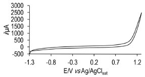![]() Figure 1. Cyclic voltammogram of 1x10-3 mol L-1 sodium ibuprofenate in 0.1 mol L-1 NaNO3 using the graphite bar as working electrode. Potential window -1.3 to 1.3 V vs Ag /AgCl, at 0.1 V s-1 potential scan rate