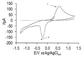![]() Figure 2. Cyclic voltammogram recorded in the 1x10-3 mol L-1 sodium ibuprofenate solution in 0.1 mol L-1 NaNO3 as supporting electrolyte with the Ag electrode. Potential window -1.3 to 1.3 V vs Ag /AgCl (sat. KCl) at 0.1 V s-1 potential scan rate. Peak I) oxidation of the Ag0, peak II) reduction of Ag+