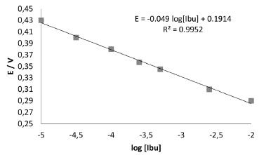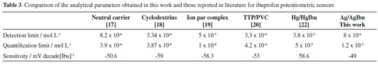 After optimizing the potential and its application period, the analytical curve was built (Figure 3), from which analytic parameters can be obtained. These are shown in Table 3, from where it can be observed that the obtained values are very competitive with others reported in literature for ibuprofen sensors. Although, the sensitivity obtained with this strategy is lower than 0.059 V decadeibuprofenate-1, which corresponds to a subNernstian behaviour.