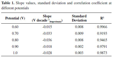 The studies demonstrate that when the Ag0 oxidation occurs to Ag+, the electrode is undergoing a changing process, because the electrodeposition of a white precipitate is taking place corresponding to formation of silver ibuprofenate. Optimization of the second type electrode Ag /AgIbu In order to modify the silver electrode to obtain the redox pair, namely Ag /AgIbu, chronoamperommetry was done imposing a potential in the 0.60 to 1 V range, then the analytical curves were built, from which the values of the slope were obtained along with their standard deviation and correlation coefficient. The results are shown in Table 1, from which it can be preliminary concluded that the optimum potential is 0.8 V, because it is the slope value closest to the Nernstian. The subnernstian value obtained may indicate that there are other complex chemical processes involved in the overall chemical equilibria that governs the electrode's response.