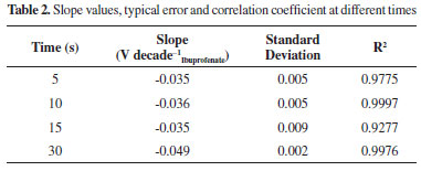 The time optimization during which the potential was imposed was carried out modifying the electrode at 0.8 V during different periods, which were chosen within the 5 to 30 s range, as can be observed in Table 2, the optimum slope was obtained at 30 s.