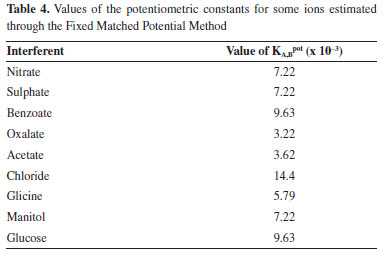 On considering the drift, this was measured acquiring a set of not random data at a constant concentration, and carrying out a linear fit, that gave a value of 0.0001 V s-1. Considering this value, constant analytical plots must be constructed during long time experiments, so the drift error can be neglected. Interferents analyses For this purpose, different ions used were commonly found in water and in some excipients used in prepared pharmaceuticals. Table 4 shows the values of KA,Bpot obtained through the Fixed Matched Potential Method. From the results obtained it can be said that the second type electrode displayed greater affinity toward the ibuprofenate ion than to the ions chosen as interfering agents.