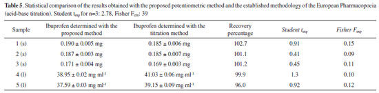 Analyses of real samples In order to obtain the concentration measured with the electrode it was thought appropriate to use the standard addition method; after performing the statistic t test on the data acquired, a comparison was established between the outcome with this work's electrode and that found with the accepted titration methodology. The results obtained are shown in Table 5.